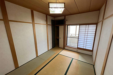 LDKの床は木目のフロアタイルに貼り替えて、家族が過ごしやすい落ち着いた空間にしました。2階の和室は襖・障子の貼替、琉球畳に新調して、モダンでおしゃれな雰囲気に仕上げました。