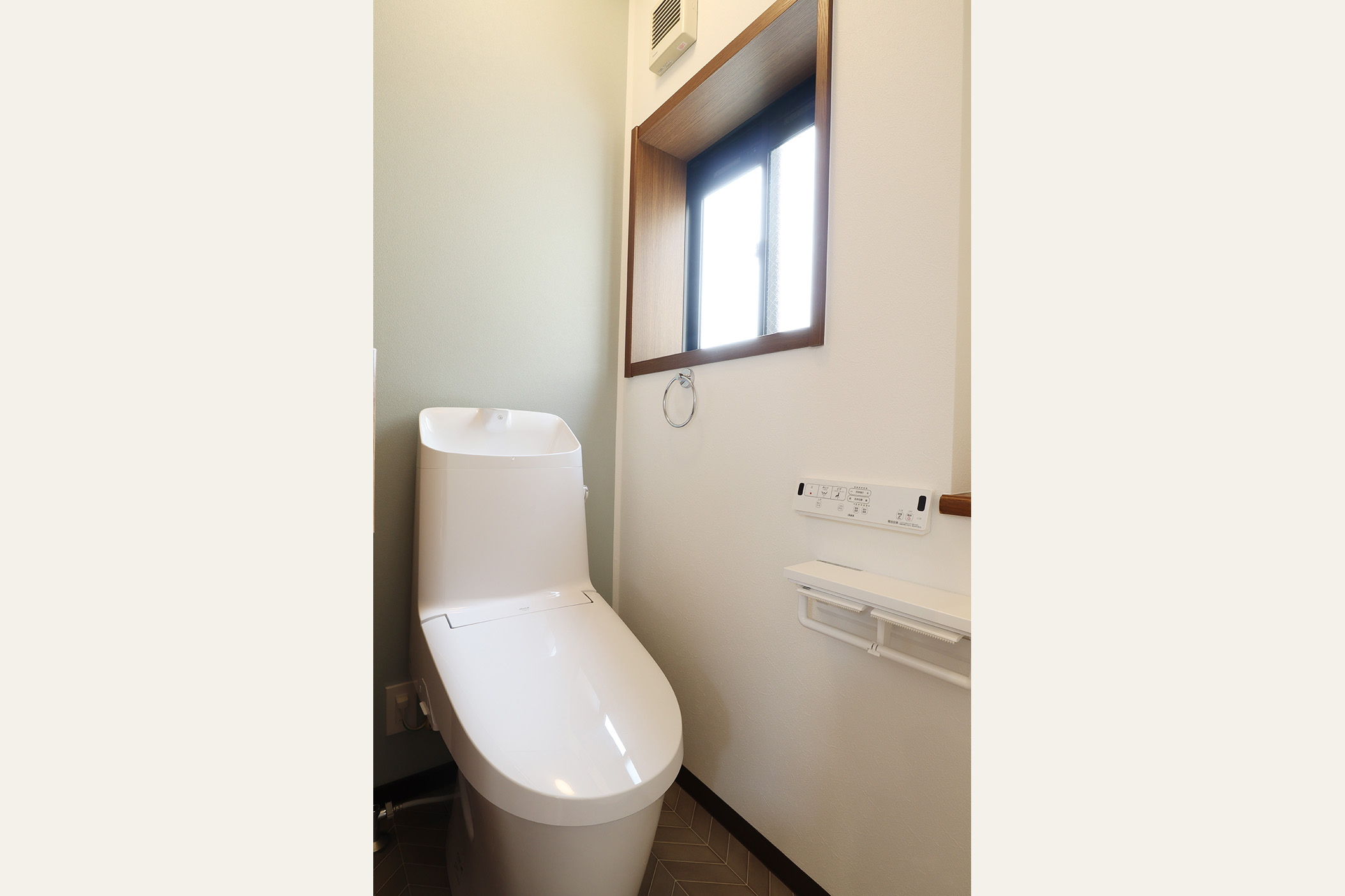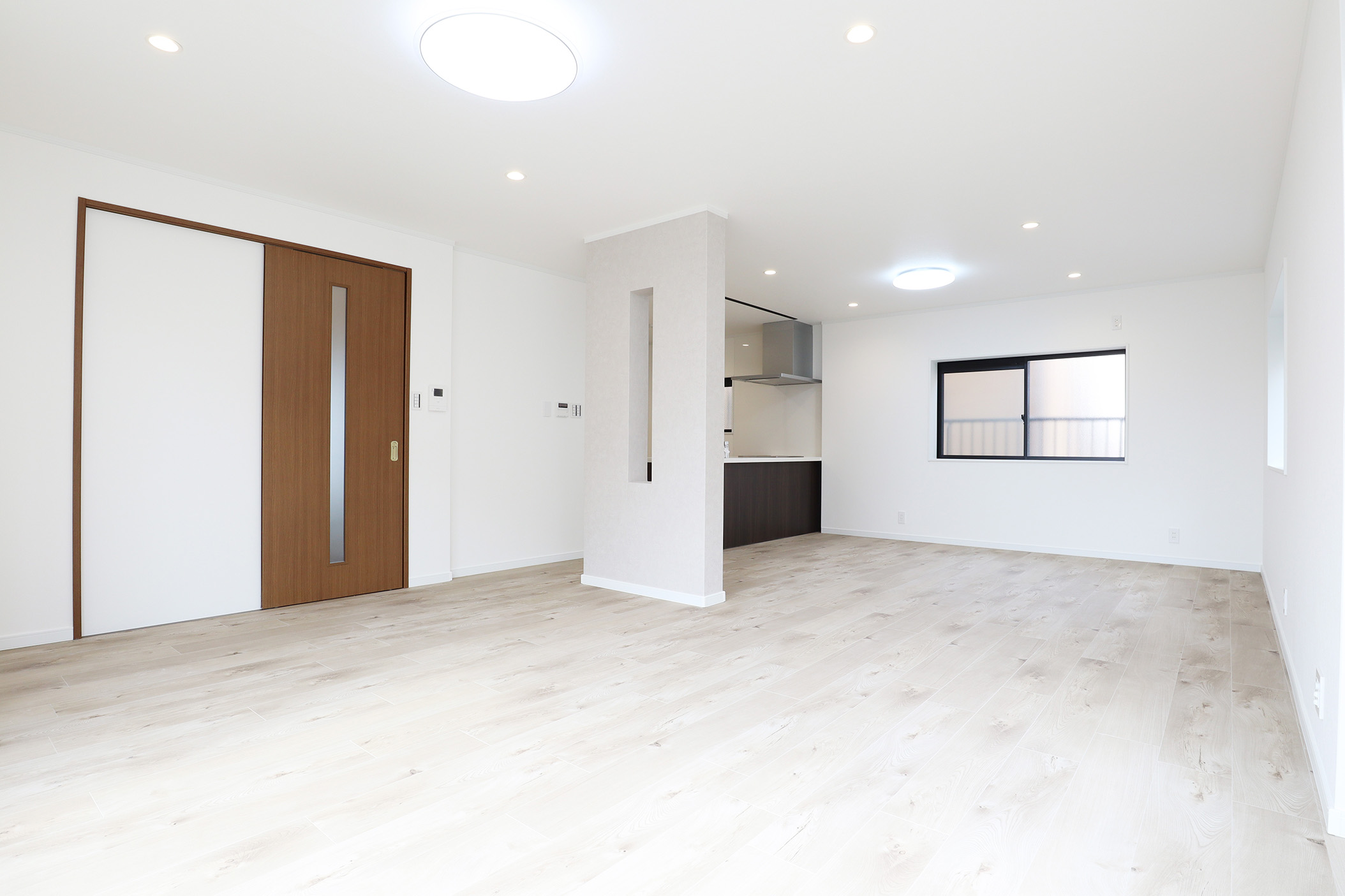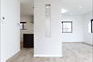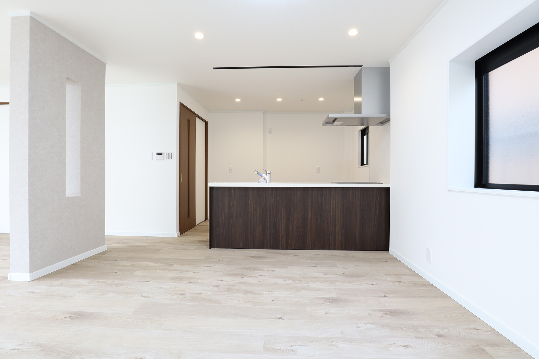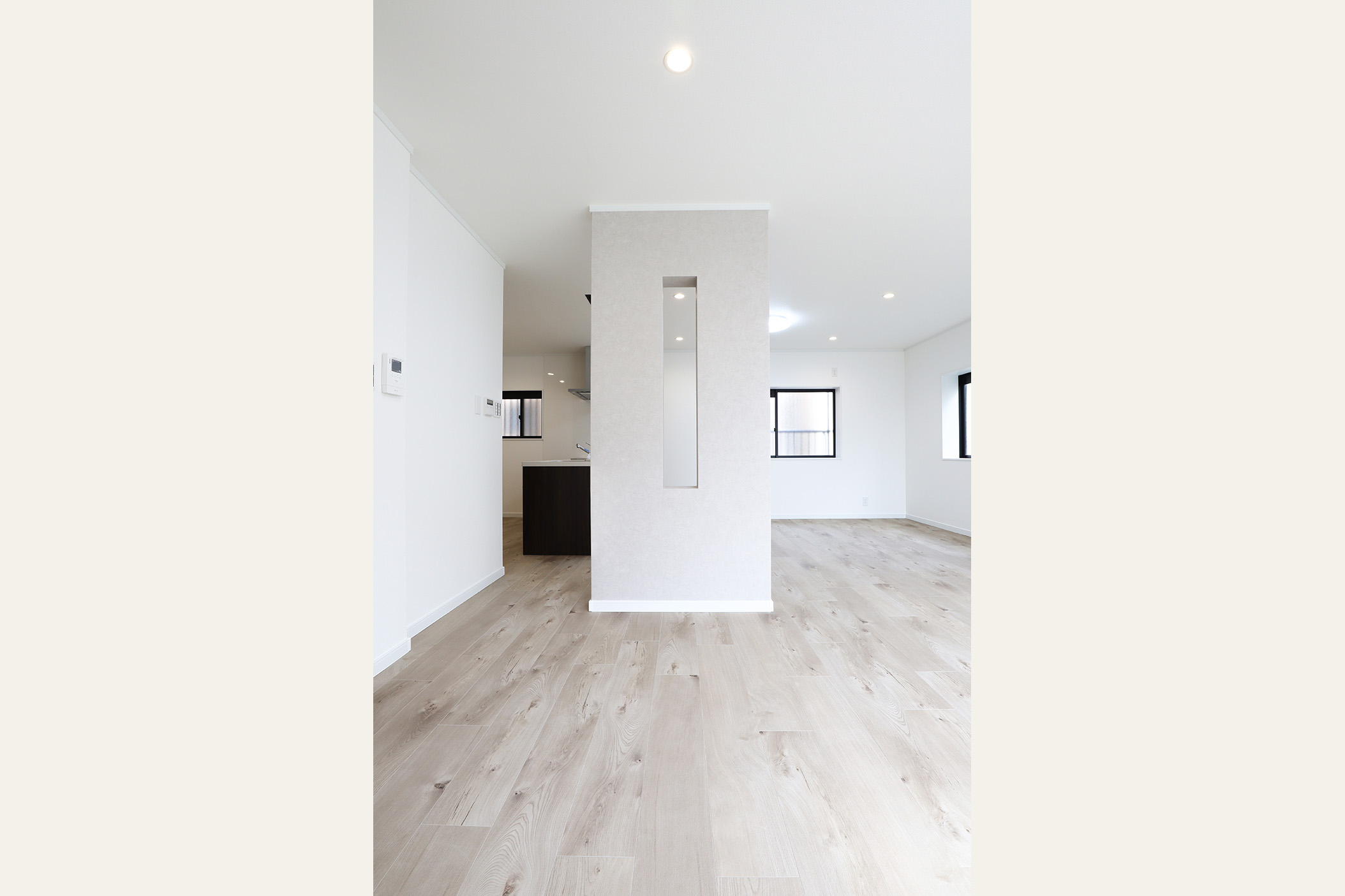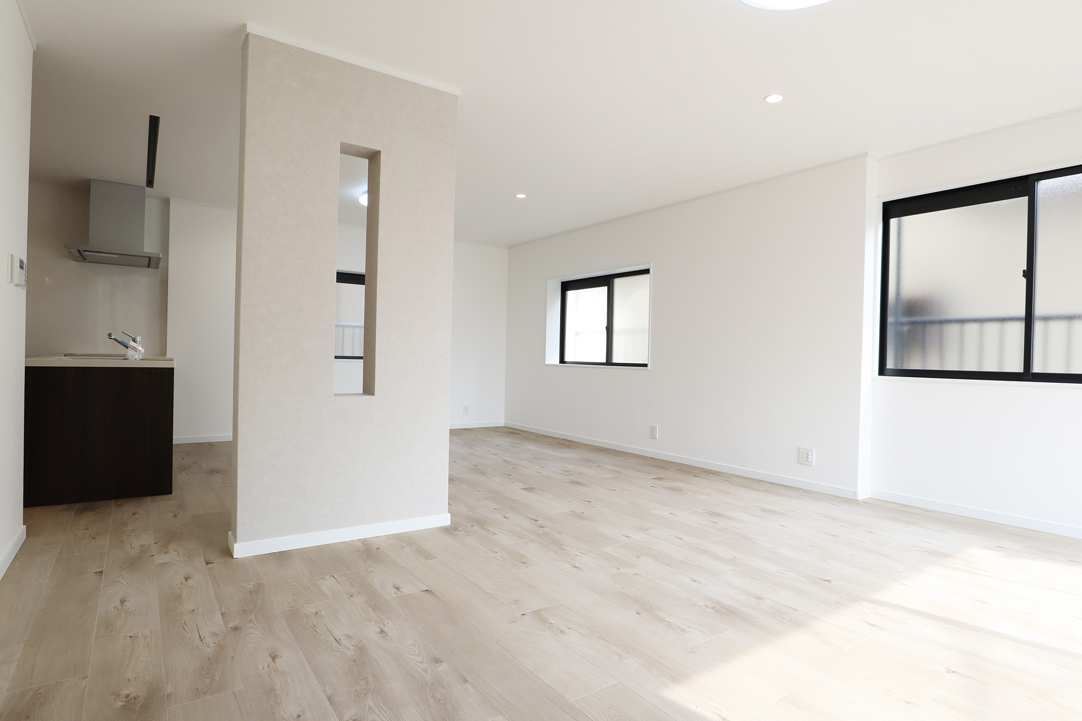 今回特にこだわったのは、2階LDKの開放感と実用性の両立です。LDKに撤去ができない大きな壁を、壁の中央を長方形にくり抜くデザインを採用し、視線の抜けを確保しました。 開放感を損なうことなく、空間のアクセントとなる“見せる柱”として再構築しました。くり抜いた部分にはお気に入りの小物を飾るなど、 “魅せるスペース”としても活用できます。 キッチンは、動線・広さ・家具配置のバランスを検討し、位置を決定。広すぎず狭すぎない、調理に集中できるちょうど良い空間を目指しました。 TVを壁掛けで設置できるよう壁の下地補強も事前に施工し、内装の見た目と利便性の両立を図り、将来の暮らしにも対応できるよう備えています。