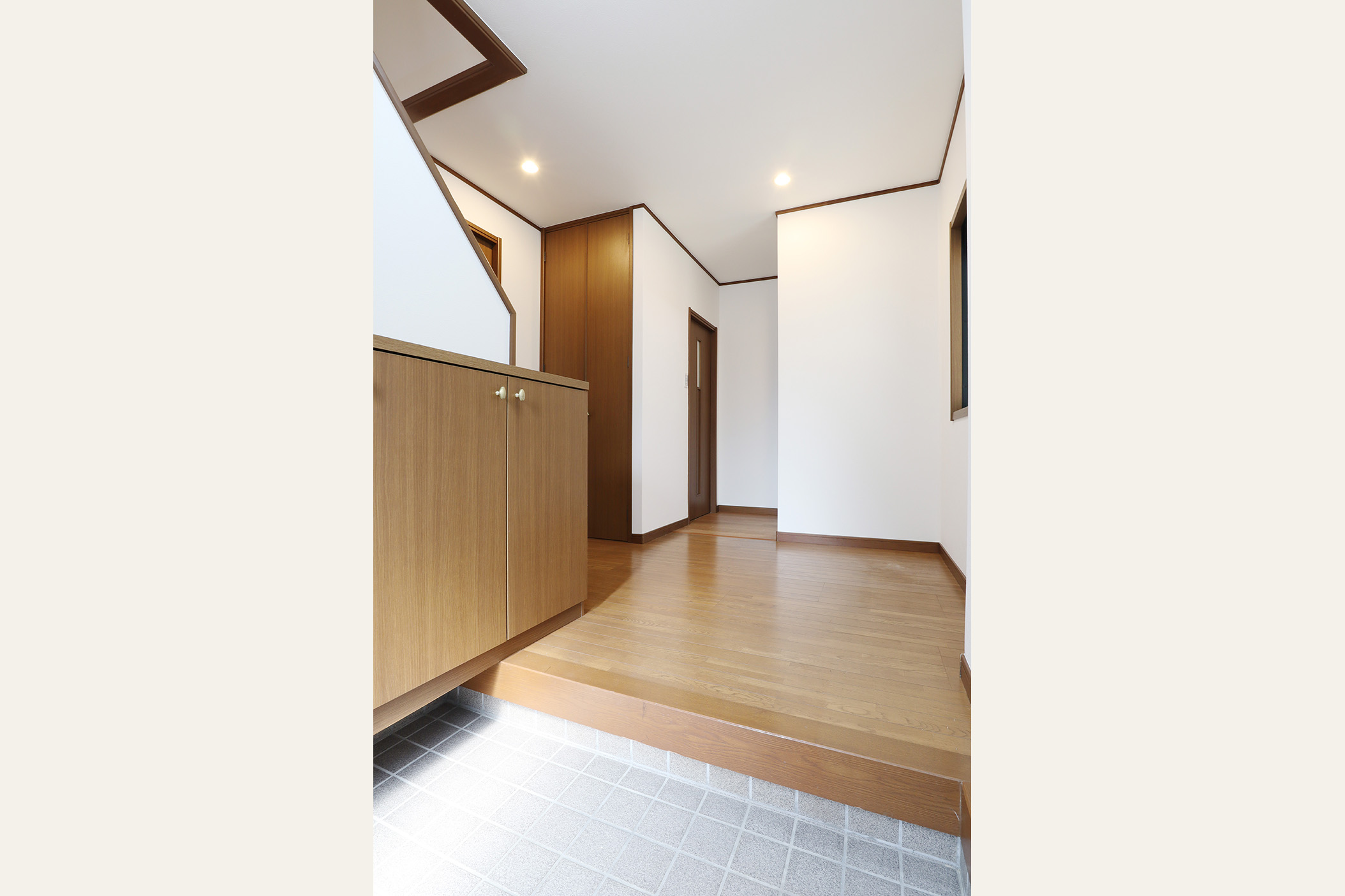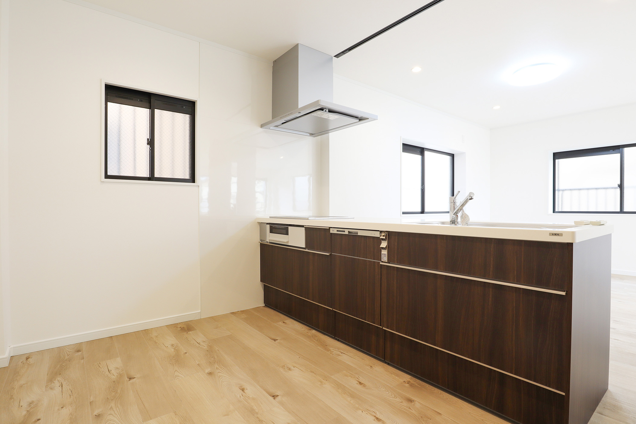 1階にあったキッチンを2階へ移設し、2階の和室と洋室をつなげて、広々とした23.7畳のLDKを新たに設けました。 キッチンは対面式のペニンシュラ型を採用し、リビング全体を見渡せる設計に。調理中でも家族の様子が自然と感じられ、コミュニケーションの取りやすい空間になりました。 もともと納戸だったスペースの壁を取り壊し、キッチンスペースを確保。作業効率を意識した配置とともに、使いやすさにこだわった導線設計となっています。 また、キッチン周りには十分な数のコンセントを新設。LDKの照明は、従来のシーリングライトのみから、ダウンライトも組込み、デザイン性もアップした明るくスタイリッシュな空間に生まれ変わりました。